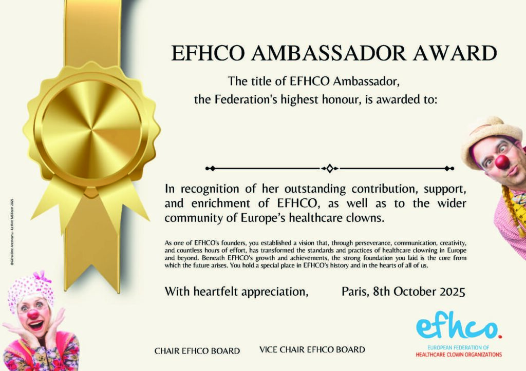 efhco was established by 8 leading European professional healthcare clown organisations in 2011 to protect and support professional clown work in healthcare environments in Europe. We honour their ongoing commitment of having supported and developped the federation’s activities with a “Nez d’Or” and serving now as our Ambassador. 👑 🔴